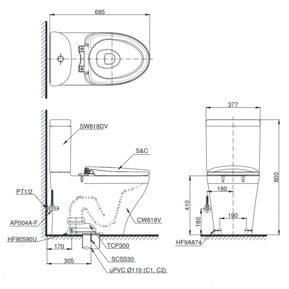 Thông số kỹ thuật bồn cầu nắp điện tử TOTO CS818CDW12 giấu dây