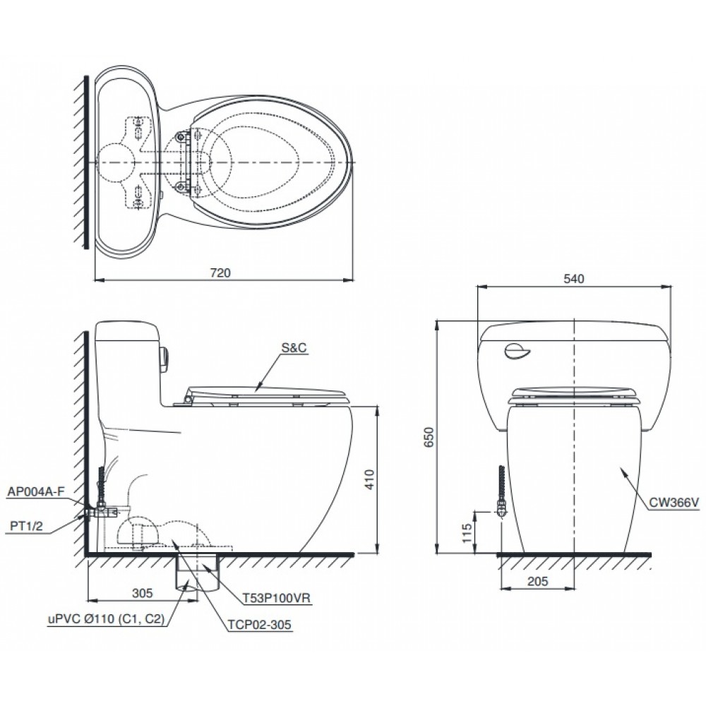 Bản vẽ bồn cầu C366 nắp điện tử TCF6531Z TOTO
