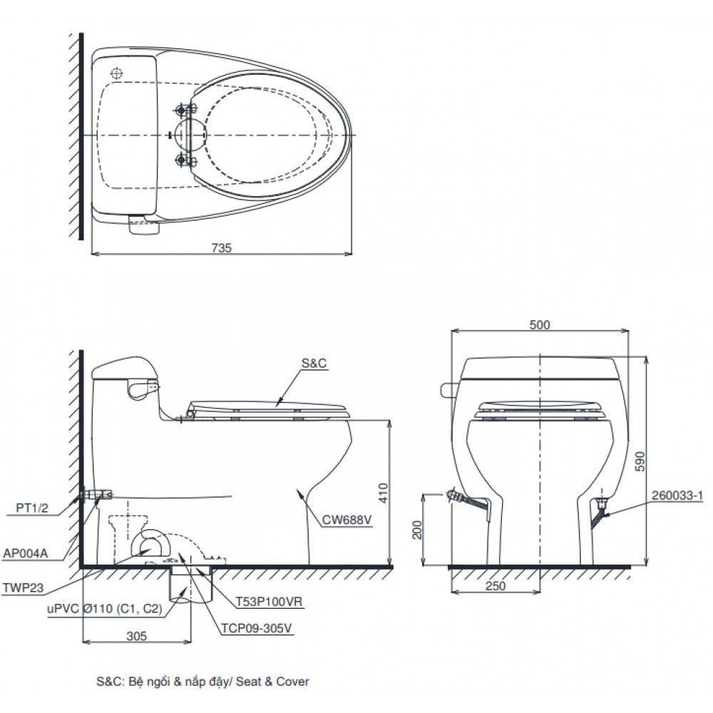 Bản vẽ bồn cầu MS668 và nắp điện tử TCF4911Z TOTO