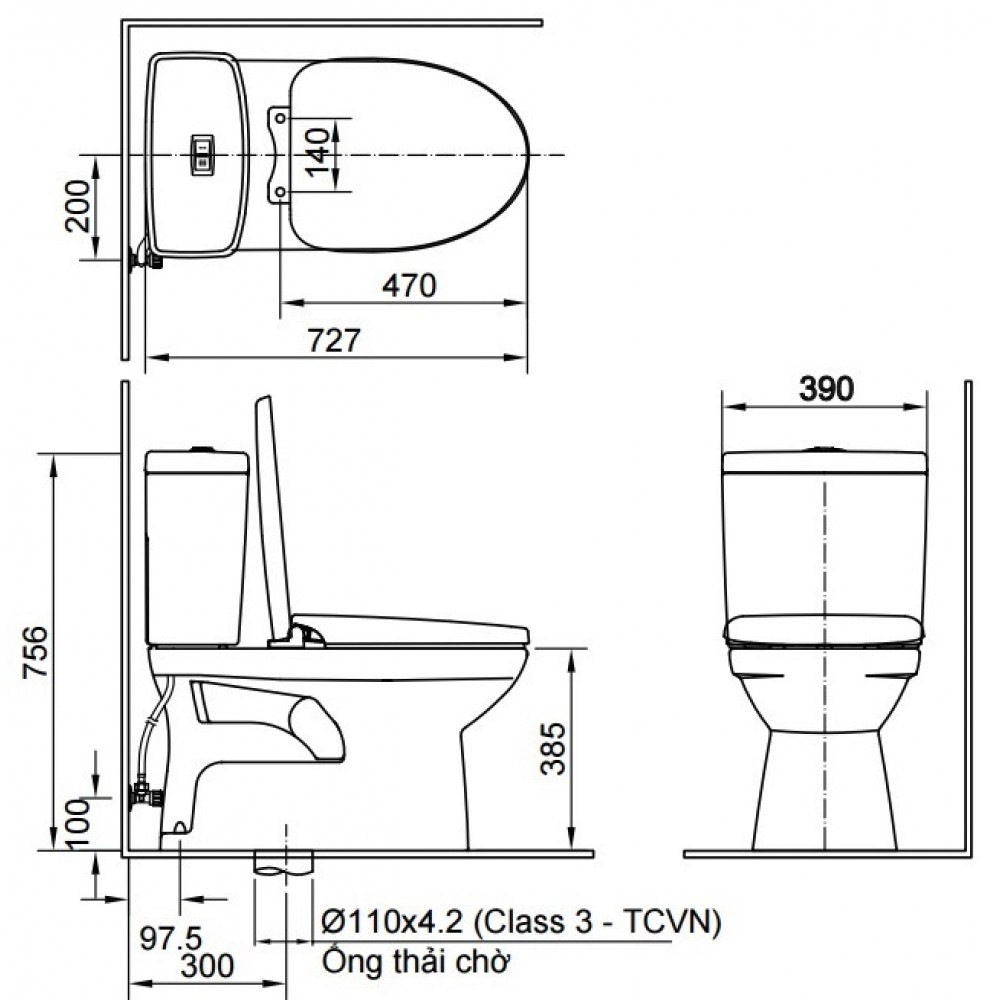 - Kích thước bồn cầu: 733 x 390 x 756 mm (dài x rộng x cao)