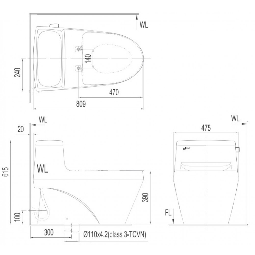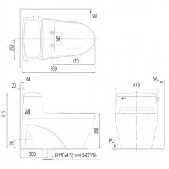 - Kích thước bồn cầu: 809 x 475 x 615 mm (dài x rộng x cao)