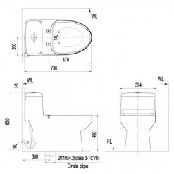 - Kích thước bồn cầu: 736 x 394 x 650 mm (dài x rộng x cao)