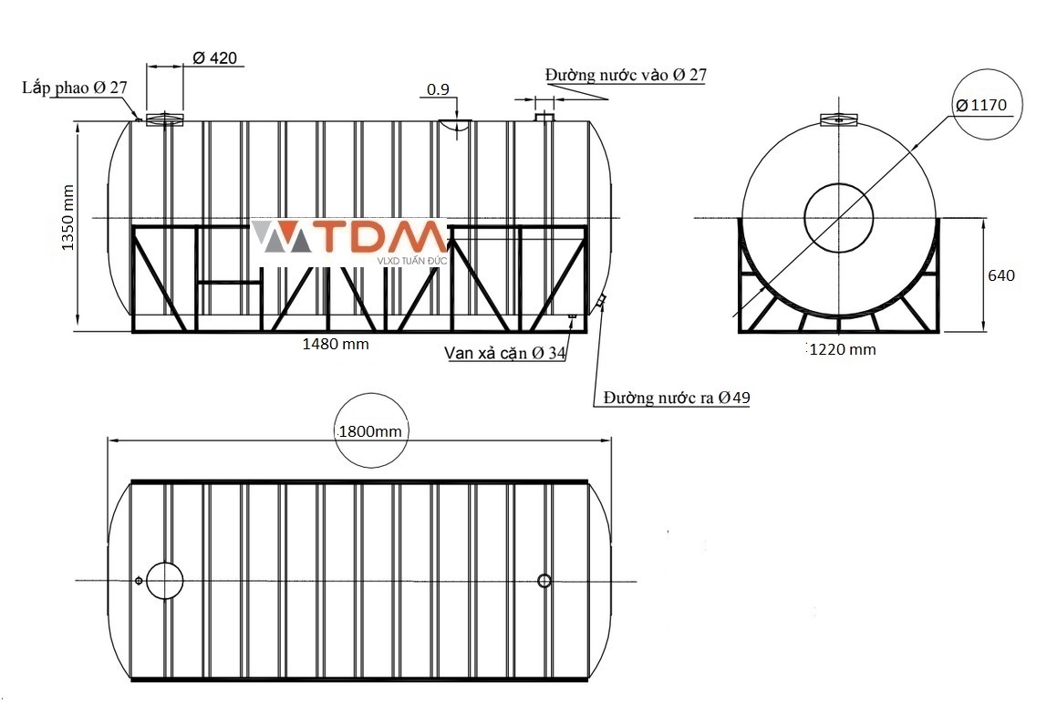 Bản vẽ téc nước inox 2000 lít nằm Đại Thành SUS 316