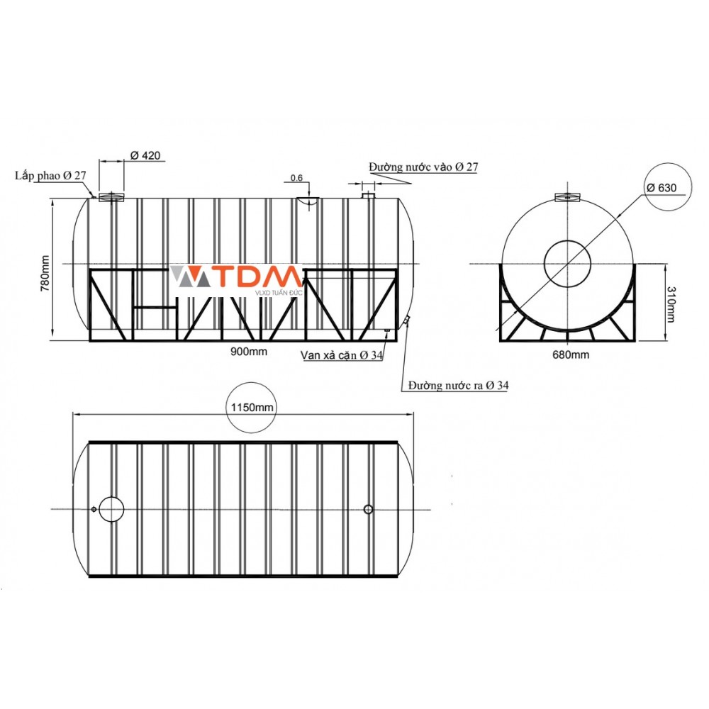 Bản vẽ téc nước inox 300 lít nằm Đại Thành SUS 316