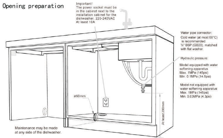 – Máy rửa chén không được lắp đặt ngoài trời hoặc vị trí có nhiệt độ thấp hơn 0°.