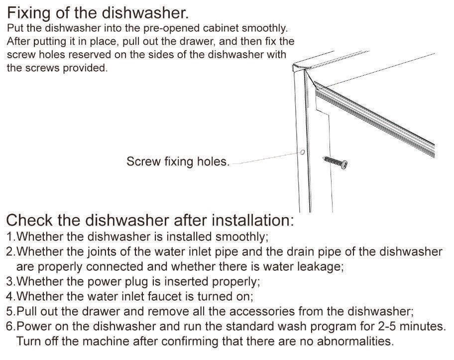 – Máy rửa chén phải được cố định bằng vít ở phía trong tủ, nếu không được cố định, thiết bị có thể bị rung lắc, dẫn đến hư hỏng hoặc thương tích cá nhân.