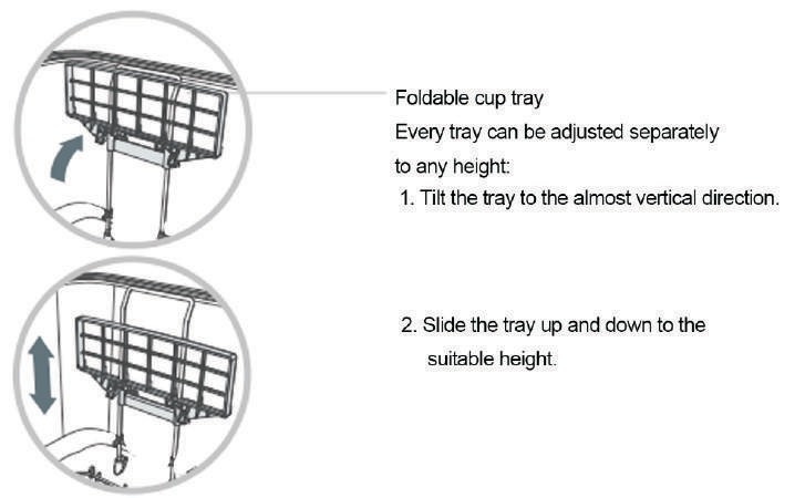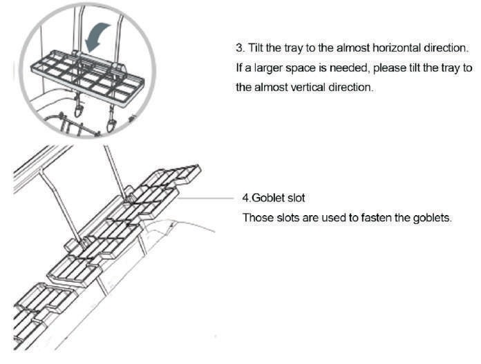 ●Khay đựng chén dĩa có thể được gấp lại để sử dụng cho việc đựng ly tách, không được dựa hoặc đè lên khay đựng.